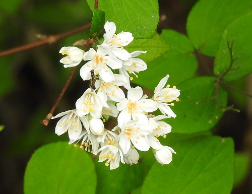 開花時期は5月下旬から6月上旬で、ウツギより早く咲きます。花はウツギと異なり、上向きに付き