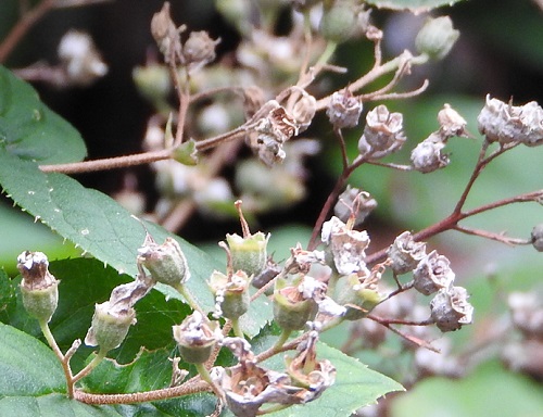 実は直径約3mmの長楕円形で、星状毛が密生し、萼片と花柱が残っています。