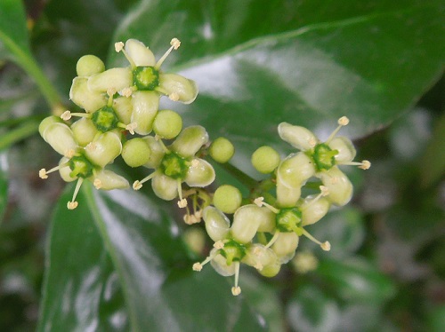 開花時期は6~7月で、葉腋から集散花序をだし、緑白色の花を多数開きます。
