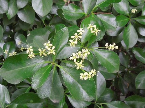 葉の質は厚く光沢があり、一見ヒサカキの葉に似ていますが、マサキの葉は対生します。