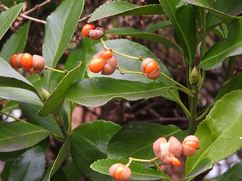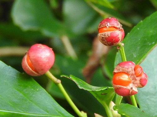 熟すと4裂して、中から橙赤色の仮種皮に包まれた種子が現れます。
