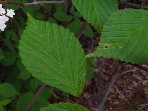 葉身長6~14cm、幅4~9cmの卵形の葉で、対生します。鋸歯や葉先はガマズミより尖り長く伸び、葉の表面の光沢が比較的強いのが特徴です。