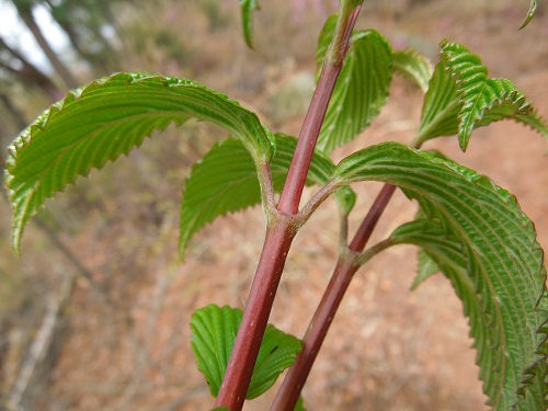 樹皮は普通灰褐色をしていますが、このような若い枝は紫褐色の赤っぽい色をしています。
