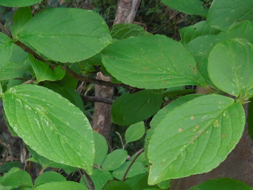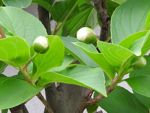 開花時期は6月から7月頃で、葉腋に1個の花柄を出し、丸い大きめのタマアジサイのような蕾を付け、