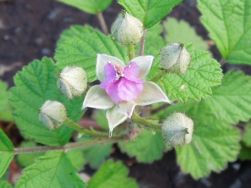 キイチゴとしては唯一ピンク色の花を上向きに付けます。