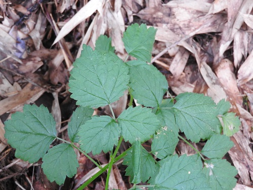 小葉は全体的に丸い形で、葉の縁には粗い重鋸歯があります。キイチゴの葉としては特徴的で覚えやすいと思います。