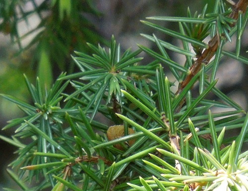 針葉樹にふさわしい細くて硬い針のような葉で、先は尖っており触ると痛い。長さは1~2.5cmです。