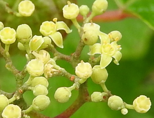 開花時期は7~8月で、葉に対生して集散花序をだし、淡緑色の小さな花を多数開きます。
