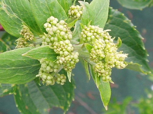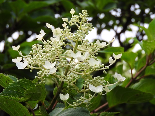 開花時期は7~8月で、枝先に長さ8~30cmの円錐花序をだし、小さな両性花多数とその周囲に白い装飾花を付けます。