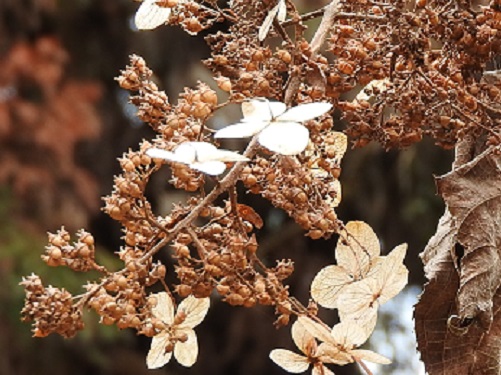 枯れた装飾花の萼片は果実が熟す頃まで紅色を帯びて残っています。