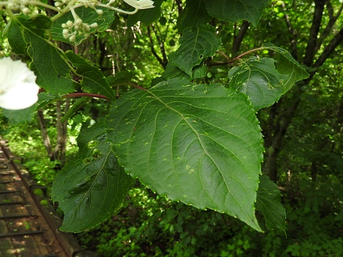 葉はヤマアジサイやタニウツギ類に似るていますが、葉柄が長くて赤みを帯びることが特徴です。