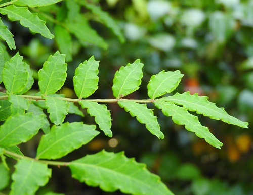 軸には、わずかに翼があります。若い葉にはしばしば小葉の中央に黄緑色の斑が入ってます。