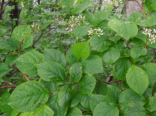 タンナサワフタギの鋸歯は粗くて大きく、先端が内側に曲がる傾向があります。