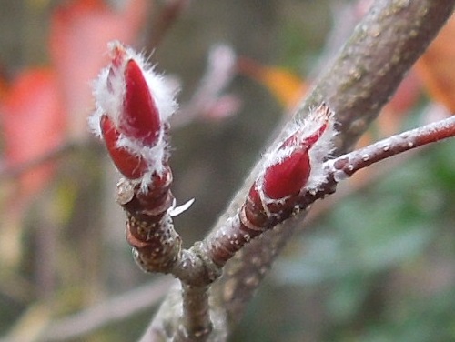 冬芽に特徴があります。芽麟は赤色~紅紫色で光沢があり、しばしば芽麟が少し開いて、白い綿毛が現れることがあります。