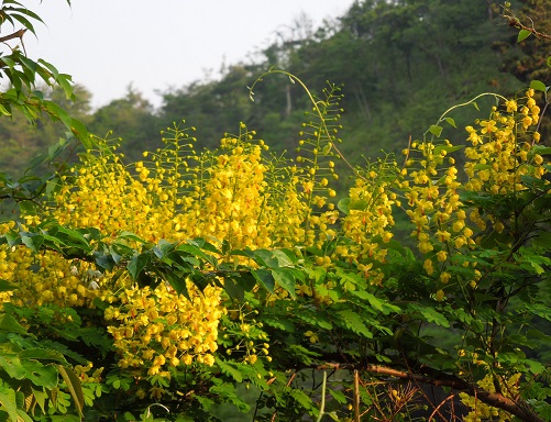 鮮やかな黄色の花を枝から直立させて総状花序を付けるので山を下りてから地上からもこの群落をよく確認できました。