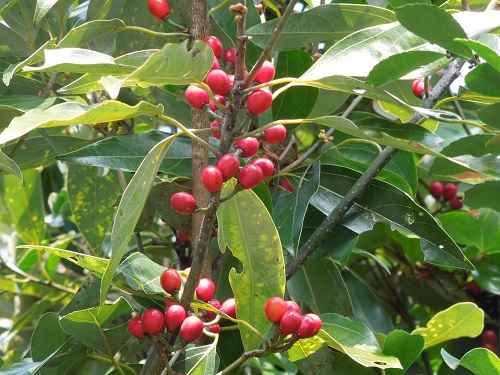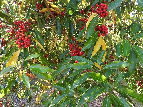 花と実を同じ時期に付けるユニークな樹です。ただし、雌雄異株なので実を付けているのは雌株だけです。