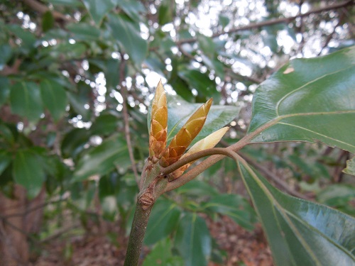 常緑ですが、葉の寿命はクスノキと同様に、1年が原則かと思われます。新葉の表面には黄褐色の毛が密生していますが、やがて無毛となります。