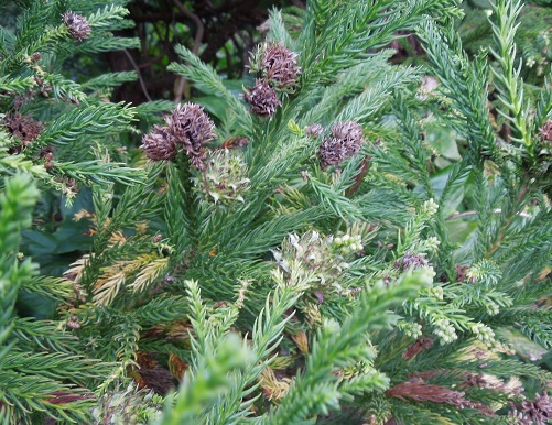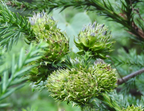 雌花は前年枝の先に1個ずつ下向きに付き、緑色で直径2~3cmの球形です。雌花は1年後に黄色くなり果鱗を開いて種を出します。