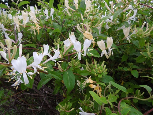 スイカズラは昼より夜の方が芳香が強くなります。これは花粉を媒介する夜行性の蛾を引き寄せるためであると考えられています。
