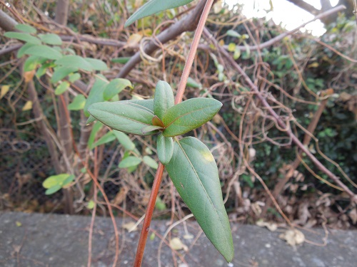 葉身長3~7cmの楕円形の葉で、対生し、成長した葉の縁は全縁です。冬期には厚めの葉になり、葉の縁がトベラの葉の様に縁が巻いた状態になり、