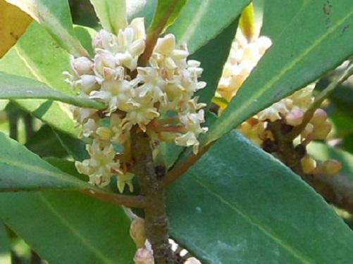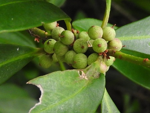 実は翌年の春まで残っているため、この写真のように熟くした黒い実と桃色を帯びた蕾が同時期に付いています。