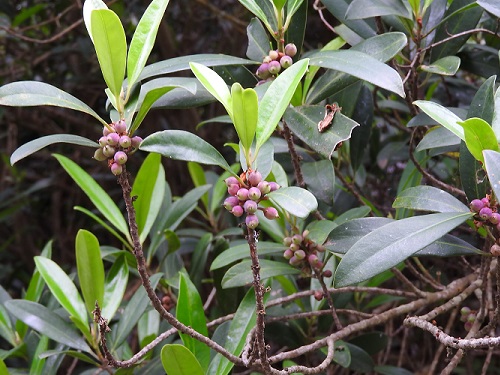 葉は互生し、縁は全縁です。細長い葉が枝先に集まって付くので、ミミズバイ、ヤマモモ、イヌマキ、キョウチクトウなどと