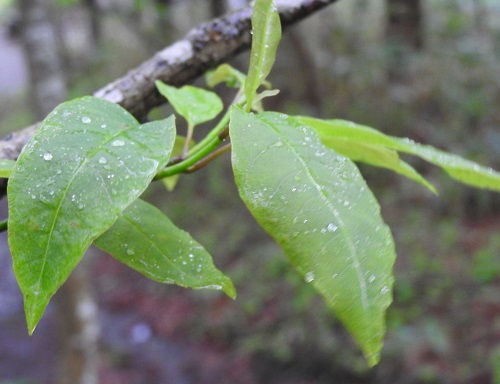 葉の形は葉身長6~12cm、幅2~5cmの披針形は全縁で、コブシに比べるとかなり細長いので区別は容易です。