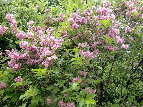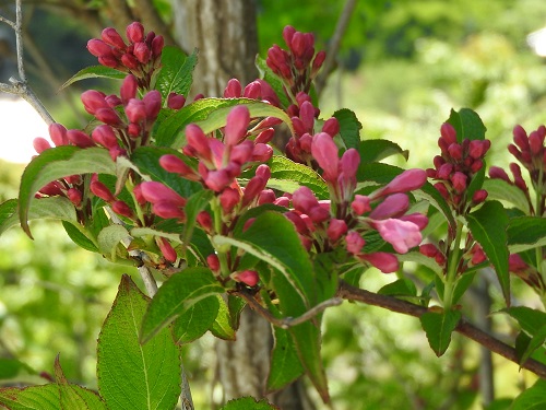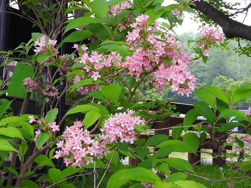 開花時期は5~7月で、本年枝の先端や葉腋から散房花序をだし、ピンク色の花を2~3個ずつ付けます。