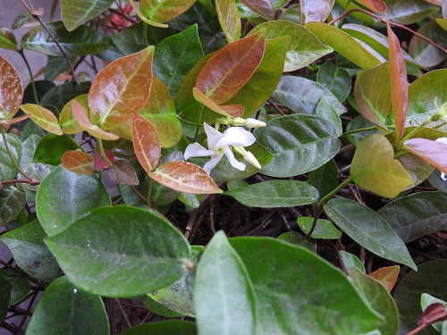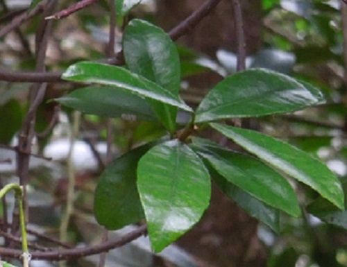 葉は対生で、葉身長3~7cmの先端が尖った楕円形をしています。葉の縁は全縁で、表面は光沢のある革質で濃い緑色をしています。