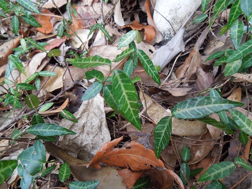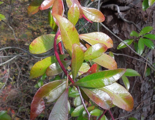 常緑性ですが古い葉は順次真っ赤に紅葉して散ります。葉の裏の葉脈が特徴的な網目模様をしています。