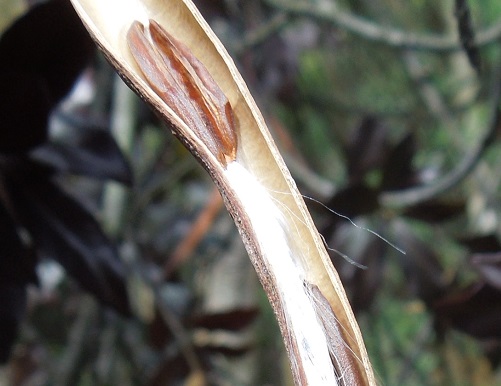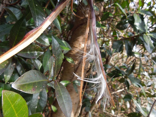 細長い鞘がはじけたところで、長い綿毛を付けた種が鞘の中から飛び出そうとしています。