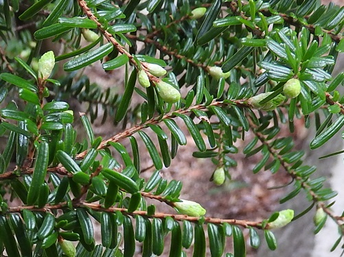特に県西部に多く、東部では稀です。宮島の弥山原始林の中核はツガ林で、また海岸近くの大元公園にも自生しています。