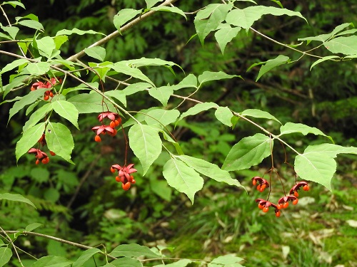 熟した果実は5裂し、朱赤色の仮種皮に包まれた種子が現れます。