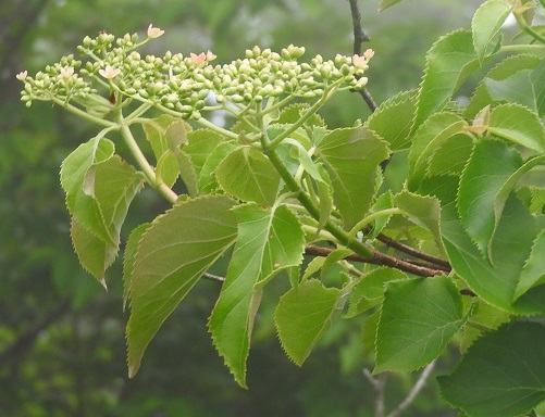 花期は6~7月で、直径10~18cmの大きな散房花序を枝先に付けます。イワガラミに似ていますが、イワガラミより早く咲きます。