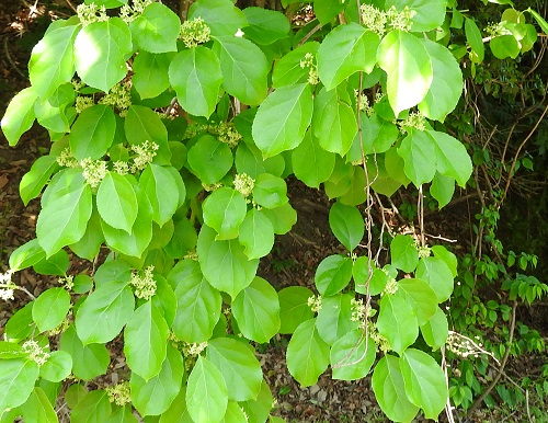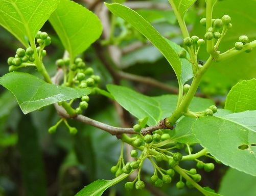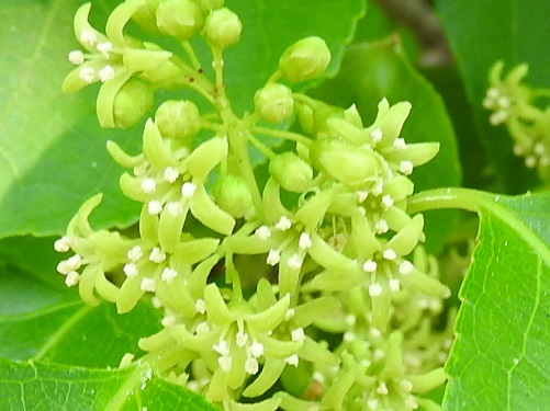 開花時期は5~6月で、葉腋から集散花序をだし、黄緑色の小さな花を10数個開きます。