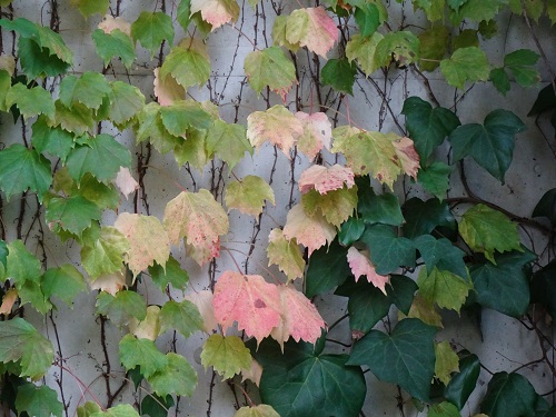 ツタとツタウルシの相違点:ツタはブドウの仲間で、落葉時に葉(葉身)の部分だけが落ちて柄(葉柄)がかなり遅くまで残っていることが多い。