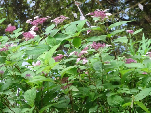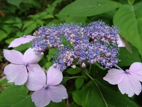 開花時期は6~8月で、小さな両性花多数と長い柄のある装飾花をつけます。