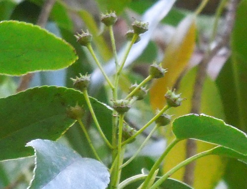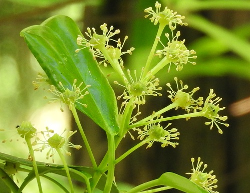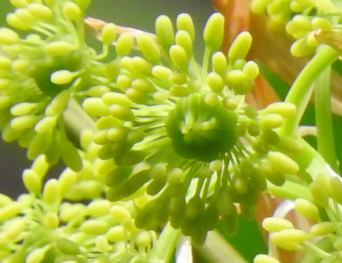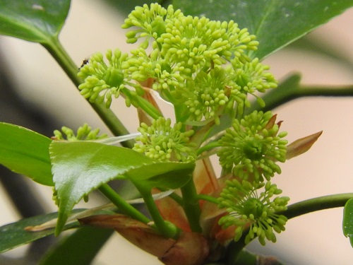 枝先に葉が輪生し、その中心からウコギ科の様に花や実が球形に近い形でまとまって付きます。