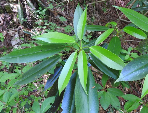 葉は倒卵形で枝先に輪生状に集まって付きます。葉は革質ですべすべした質感で光沢があります。円形に近い葉からかなり細長い葉まで変異が多い。