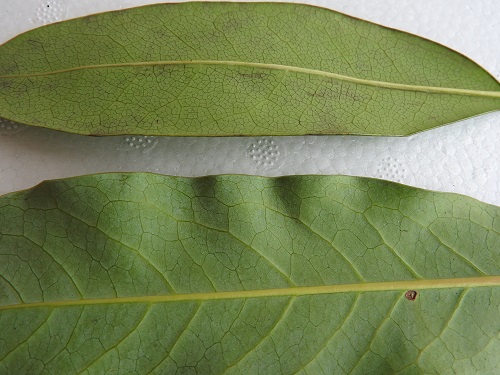 葉は長さ15~20cmで、幅3~7cmと細長い葉で先は尖り、枝先に集まって付き下向きに垂れることが多い。