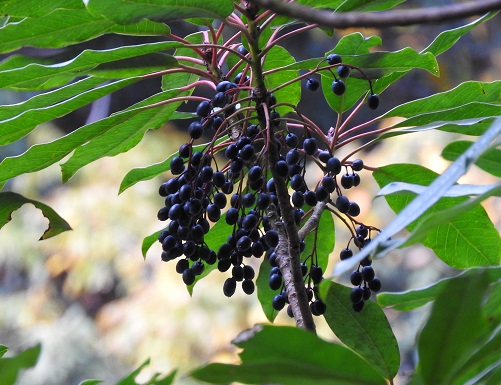果実は8~9mmの球形で、11~12月に黒く熟し、表面が粉をふいたように白くなります。