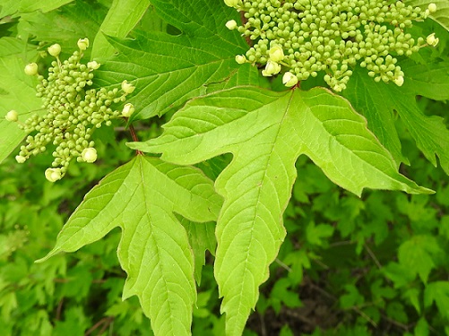 分裂した葉に大ぶりな鋸歯が少数(3~4個)あるか時に全縁です。花はムシカリに似ています。