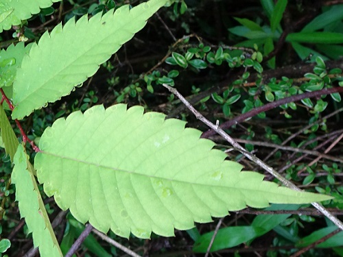 ④エゾエノキ:鋸歯は葉の基部近くまであり、鋸歯はエノキより粗く尖っています。