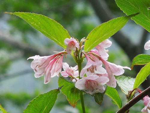 ①タニウツギ:淡いピンク色の綺麗な花を付けます。花筒は下部から次第に膨らみます。