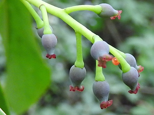 ③エゾユズリハ:9~10月に黒く熟し、花序は垂れ下がる。表面は光沢があり、粉をふきません。
